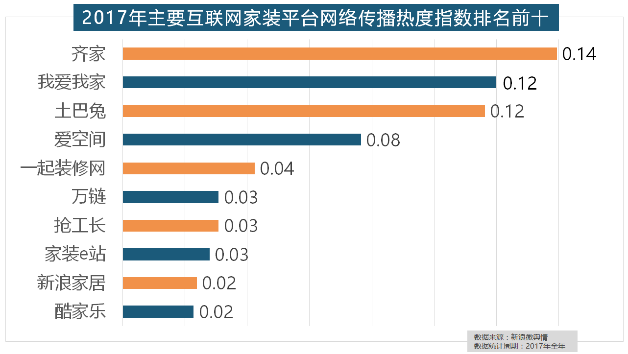 除各保守家拆设想企业逐鹿我国度拆市场外,近年来,据新浪微舆情对我国次要互联网家拆平台大数据阐发显示,2017年,齐家、我爱我家、土巴兔、爱空间、一路拆修网的收集热度指数排名前五,万链、抢工长、家拆e坐、新浪家居、酷家乐正在年度互联网家拆平台热度榜上排名第六到第十位。